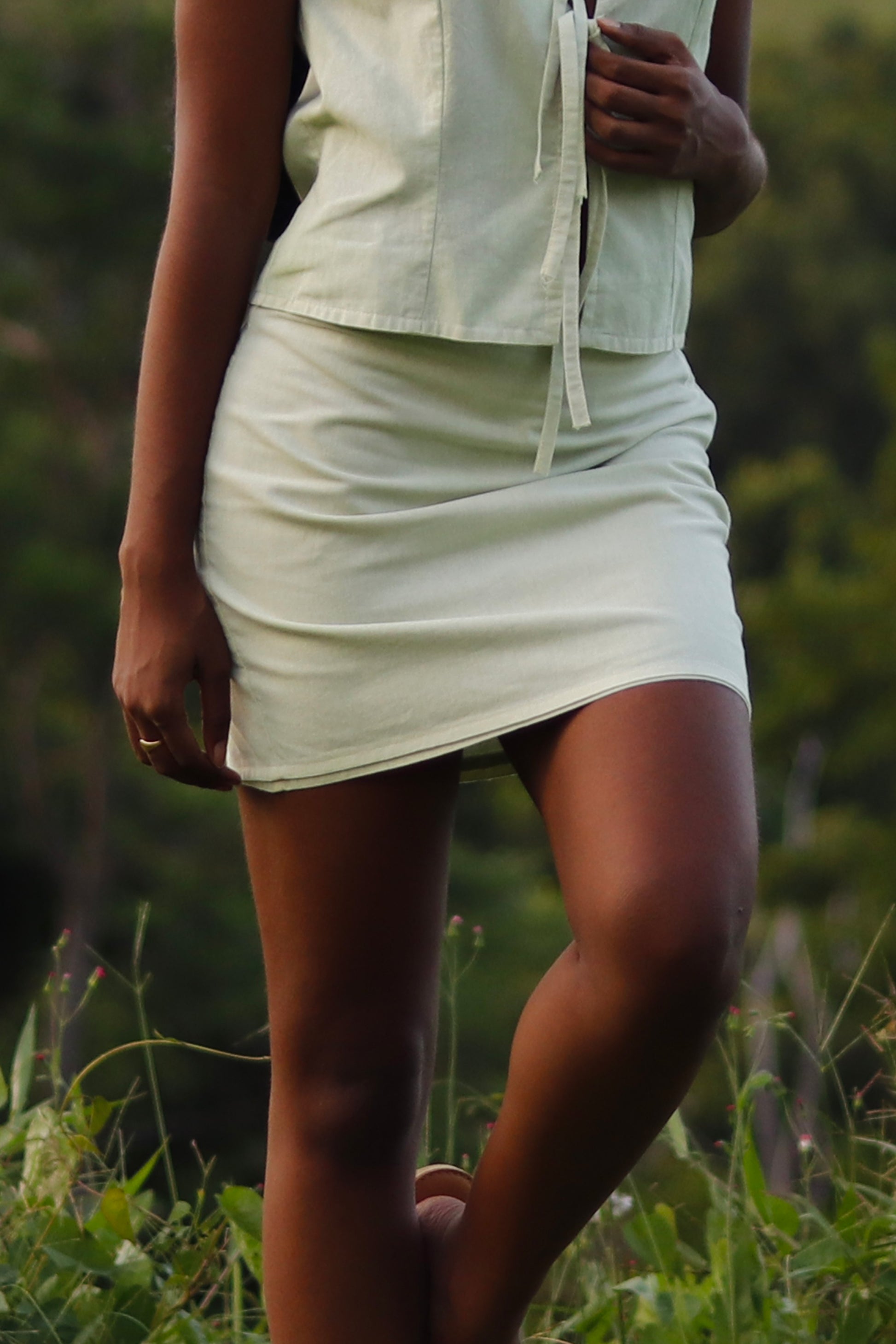 Grâce à sa ligne simple et soignée, la jupe Mimosa s'associe facilement : avec le haut Mimosa uni pour un ensemble harmonieux, ou avec une pièce plus marquante de ton dressing pour un contraste subtil.