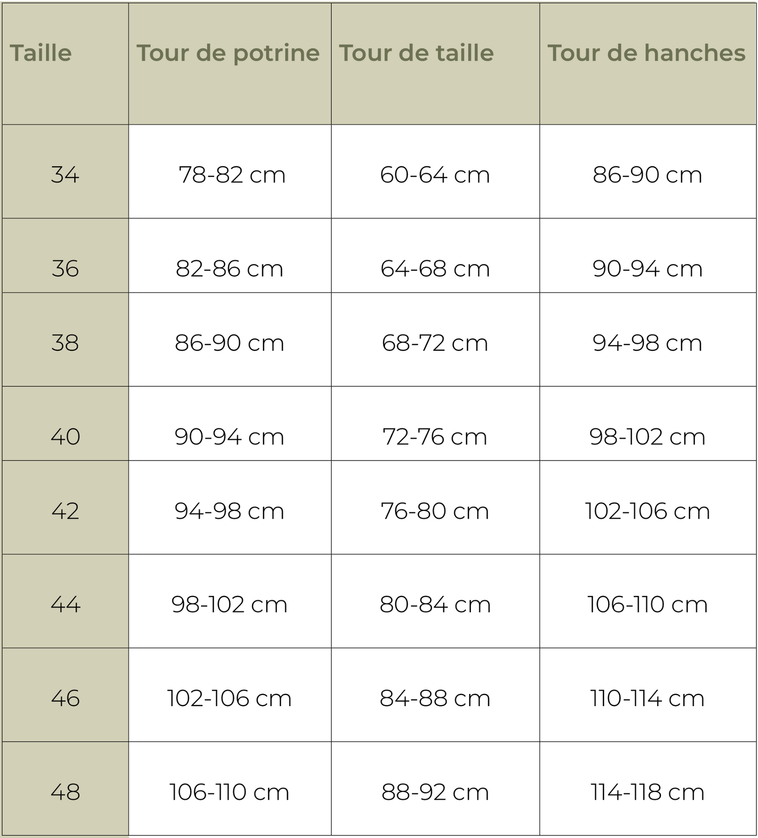 Les vêtements sont disponibles sur le site dans une gamme de tailles allant du 34 au 48 (voir le tableau des tailles). Les tailles se situant en dehors de cette gamme seront disponibles sur-mesure et à la demande.